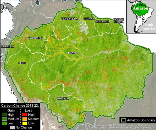 Het Amazonegebied fungeert ternauwernood nog als koolstofput, waarbij de koolstofwinst groter is dan het verlies. Het Amazonegebied verliest koolstof aan de atmosfeer door ontbossing, houtkap, door mensen veroorzaakte branden en natuurlijke verstoringen zoals de aanleg van wegen. Aan de andere kant neemt het koolstof op door bosregeneratie en oerbossen die koolstof in de atmosfeer blijven vastleggen. Tussen 2013 en 2022 is er 64,7 miljoen ton bovengrondse koolstof bijgekomen.[1]
