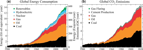 [[Bestand:Global energy consumption and CO2 emissions.png|gecentreerd|miniatuur|500x500px|''Mondiaal energieverbruik en CO<sub>2</sub>-uitstoot. Bron: Hansen et al. (2023).''<ref>[https://academic.oup.com/oocc/article/3/1/kgad008/7335889<nowiki>Global warming in the pipeline | Climate Change]</nowiki></ref>]] | |||