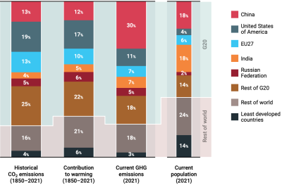[[Bestand:Current and historic contributions to climate change.png|gecentreerd|miniatuur|400x400px|''Huidige en historische bijdragen aan klimaatverandering. Bron: UNEP.''<ref name=":0" />]] | |||