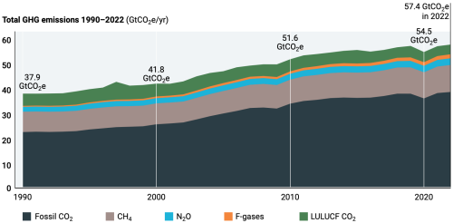 De wereldwijde uitstoot van broeikasgassen is van 2021 tot 2022 met 1,2 procent gestegen tot een nieuw record van 57,4 gigaton CO2-equivalent (GtCO2e).[4]