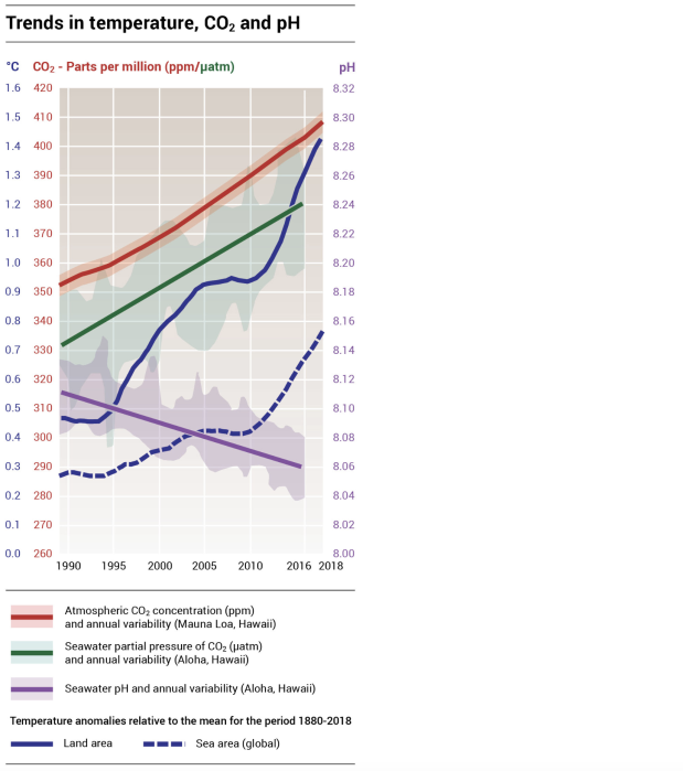De concentratie van het broeikasgas kooldioxide (CO2) is enorm toegenomen sinds het begin van de industriële revolute.[9] De oceaan adsorbeert 30% van de CO2 in de atmosfeer en dus is de concentratie ook hier toegenomen. Opgelost vormt CO2 met water een zwak zuur door de vorming van waterstof ionen. De oceanen worden daardoor zuurder (m.a.w. de pH-waarde van het zeewater neemt af). De toename van CO2 in de oceanen heeft ervoor gezorgd dat de gemiddelde concentratie waterstof ionen met 30% is gestegen sinds het begin van de industriële revolutie (de pH is gedaald van gemiddeld 8,2 naar 8,05)[11].