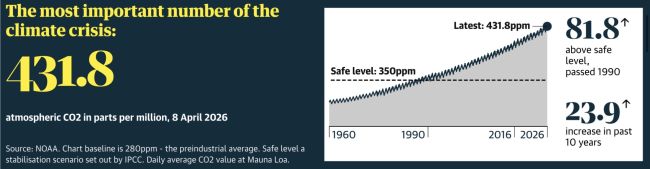 [[Bestand: | [[Bestand:CO2 concentration 9-4-26.jpg|gecentreerd|miniatuur|650x650px|''Het belangrijkste getal van de klimaatcrisis, de concentratie van CO<sub>2</sub> in de atmosfeer. Het niveau voor de Industriële Revolutie was 280 ppm. Het IPCC heeft als veilig niveau voor de stabilisatie van de opwarming 350 ppm bepaald. Het huidige niveau — en stijgend — ligt daar ver boven. Gegevens van NOAA. Met dank aan Guardian News & Media Ltd.''<ref>[https://www.theguardian.com/environment/2009/sep/26/350-carbon-atmosphere-copenhagen-mckibben Why 350 is the most important number on the planet | The Guardian]</ref>]] | ||